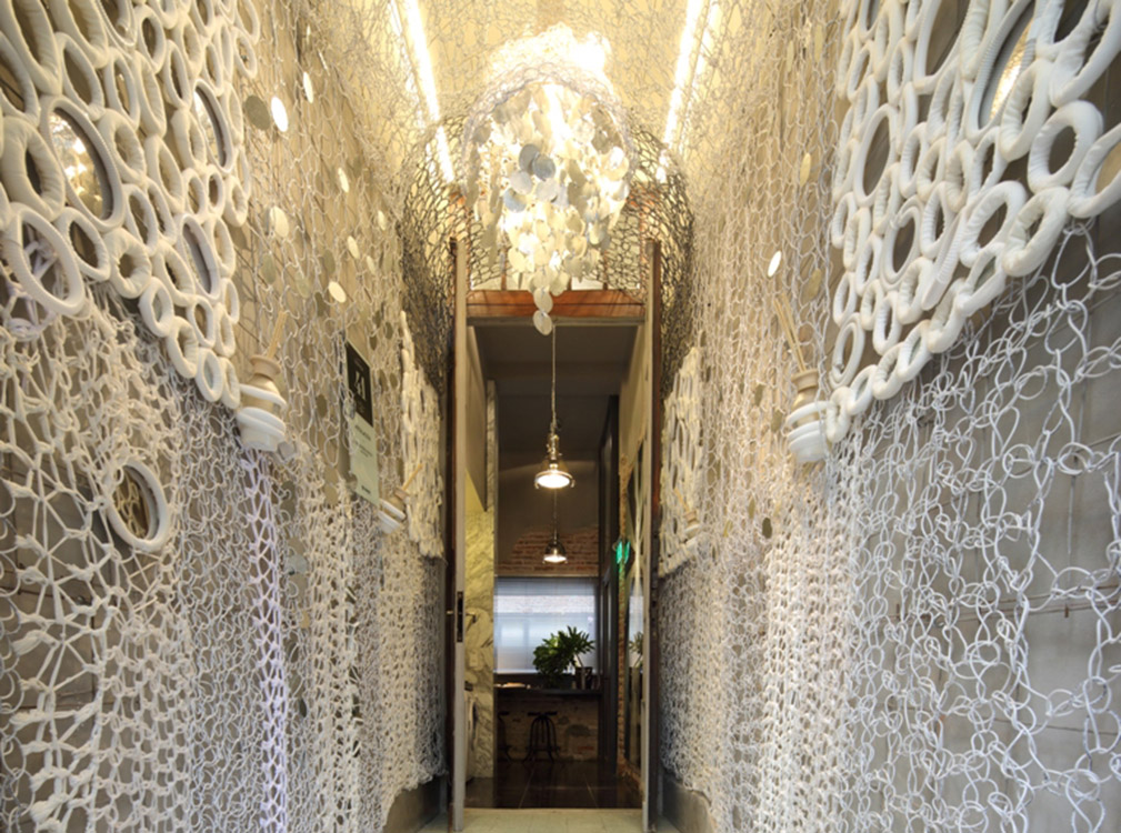 La instalación está dividida en tres partes: la primera y la tercera tejida con una trama de red blanca con círculos de totora, medias y círculos espejados y un cielo raso hecho en cable gris. La segunda tejida en cables y totoras blancas con una lámpara colgante central tejida en cable con caireles de chapa.
